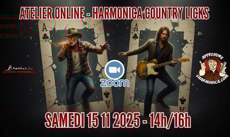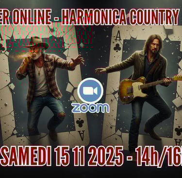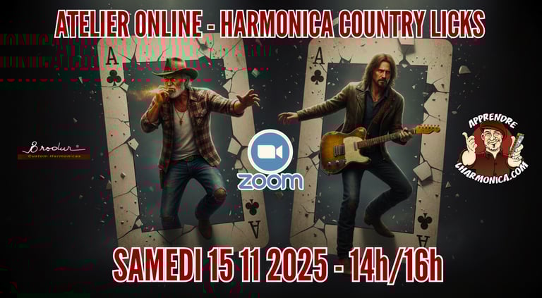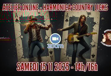 Le samedi 15 novembre 2025, de 14h à 16h, perfectionnez votre jeu lors de cet atelier Zoom entièrement dédié aux licks Country à l'harmonica.