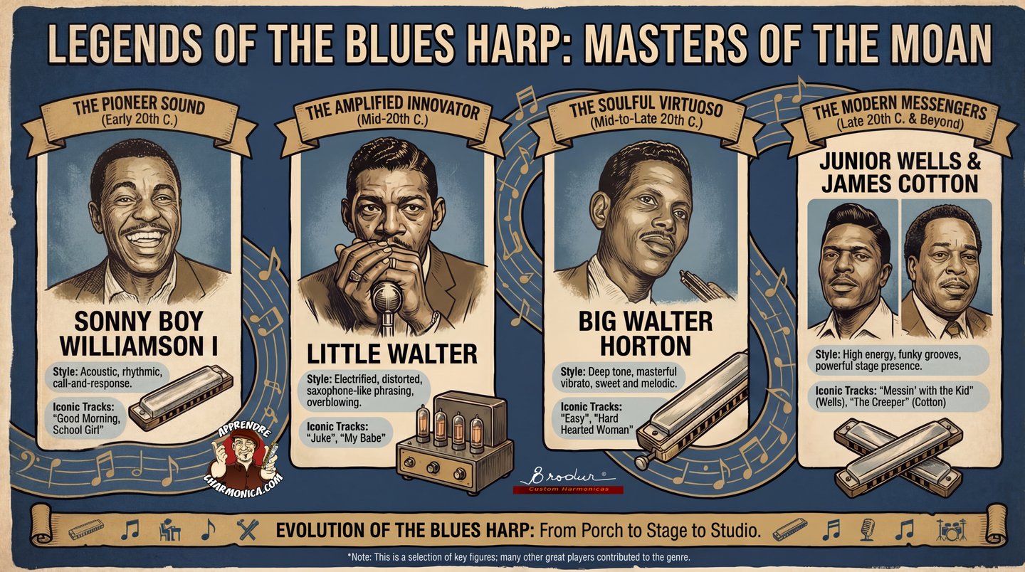 Il existe plusieurs types d’harmonicas, mais les deux plus connus sont le diatonique (10 trous en général) et le chromatique. Leurs conceptions et usages sont différents.