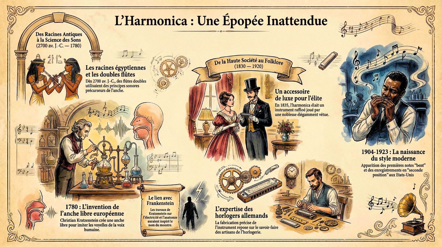 L'harmonica est un paradoxe : un instrument millénaire né dans les poussières de l'Égypte, perfectionné par un savant "Frankenstein" cherchant à recréer la parole humaine, et transcendé par des musiciens rebelles. Maintenant que vous savez que chaque note transporte l'écho des pyramides, l'ambition des alchimistes de la voix et la rigueur des marches militaires, l'écouterez-vous de la même manière ?