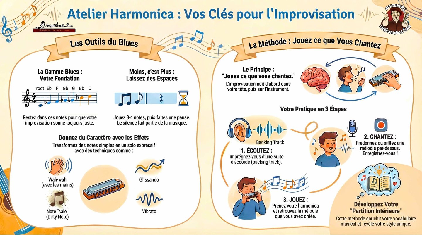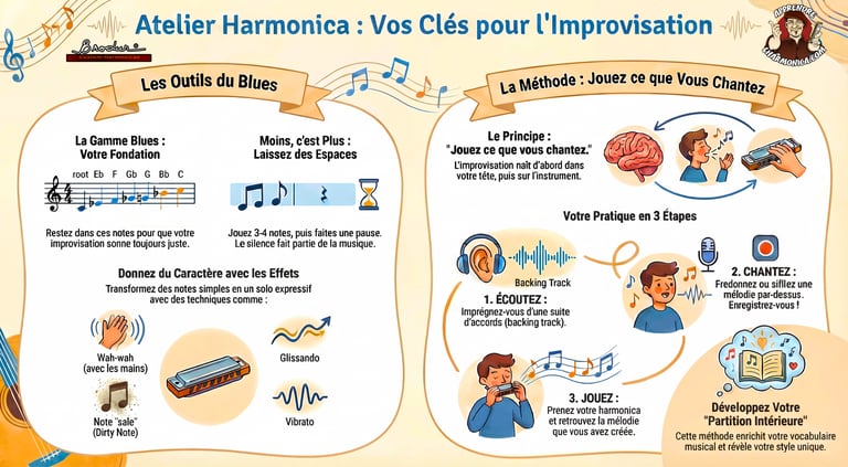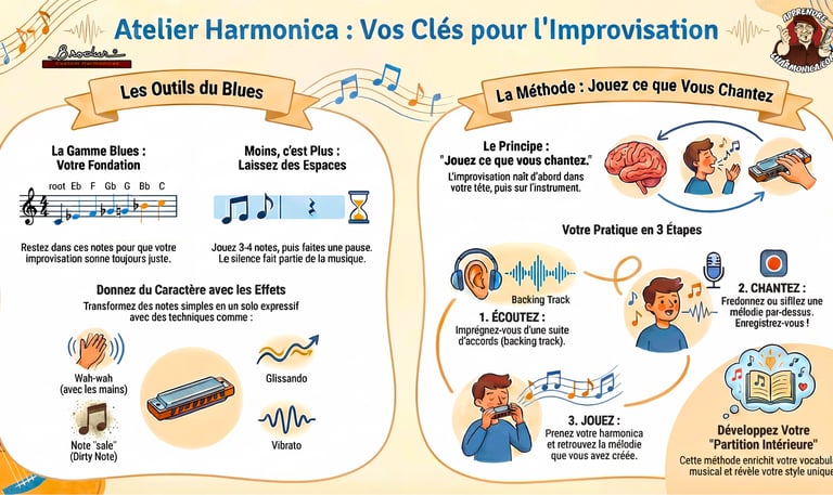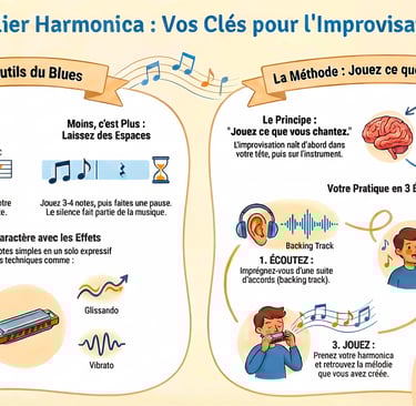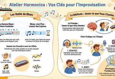 1. La Méthode Naturelle : "Jouez ce que vous chantez"mprovisation naît d'abord dans votre tête, pas dans l'harmonica. Nous allons développer votre "Partition Intérieure" grâce à un processus intuitif en 3 étapes :
